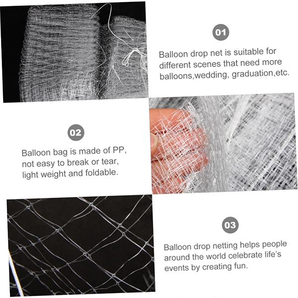 Notre filet à ballons peut être utilisé pour toutes sortes d'activités de lâcher de ballons. Pour les fêtes d'anniversaire surprises et les fêtes de réveillon du nouvel an, vous pouvez l'utiliserfilet de ballonpour surprendre vos invités. Créez des souvenirs inoubliables de vos activités avec ce filet de largage de ballons fiable.