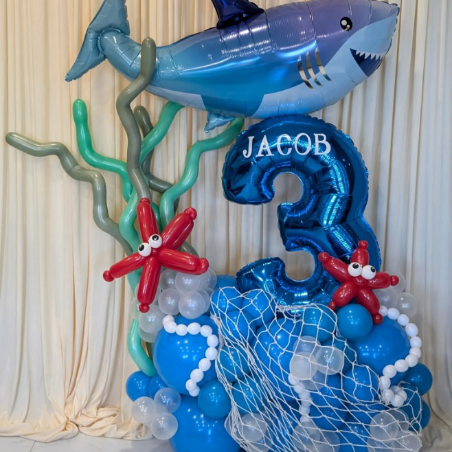 2. ballon en papier:Balon Garland avec des ballons en feuille de requin, cet paquet est équipé de ballons en papier de papier de dessins de dessins animés, tels que des requins, des étoiles de mer, des méduses et des hippocampes. De plus, nous pouvons également concevoir des ballons en papier d'aluminium personnalisés pour vous selon votre motif pour créer une guirlande de ballon unique avec des ballons en feuille de requin.