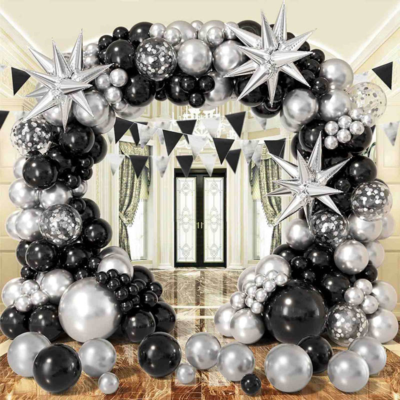 R : Le kit comprend généralement des ballons en latex noir et argenté de différentes tailles, des chaînes de ballons, des points de colle, des rubans et une pompe à air (certains styles l'ont). Certains kits ajoutent également des ballons étoiles ou ronds supplémentaires. Ils donnent à toute la décoration plus de couches.