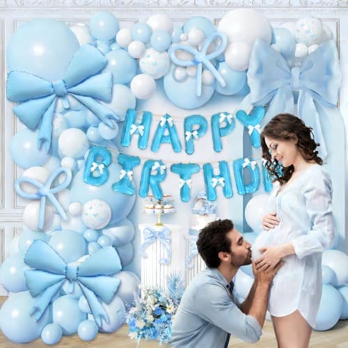 Cet ensemble comprend un ballon de couleur bleu macaron en 5 pouces, 10 pouces, 12 pouces et 18 pouces, une couleur blanc mat en 5 pouces, 10 pouces, une bannière de joyeux anniversaire, un ballon à nœud bleu macaron en aluminium, un ballon long bleu macaron 260, un nœud en ruban, un point de colle et une bande de décoration de ballon.