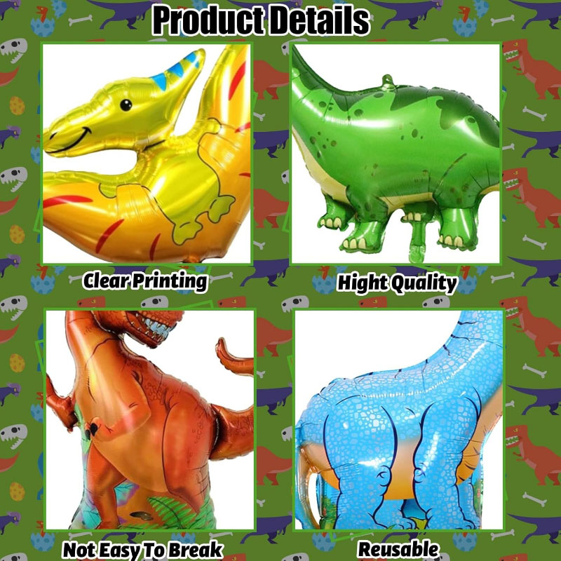 Les ballons en feuille de dinosaure de dessins animés fabriqués en Chine sont fabriqués à partir d'aluminium de haute qualité avec un lustre métallique. Tous les ballons en feuille de dinosaure de dessins animés sont sûrs, durables, non toxiques et réutilisables. Le ballon en feuille de dinosaure de bande dessinée de la jungle a une valve auto-scellant, pas besoin de nouer des nœuds, facile à gonfler et à dégonfler, peut être gonflé avec de l'air ou de l'hélium, il suffit de remplir 90% du gaz, le ballon peut être complètement élargi.