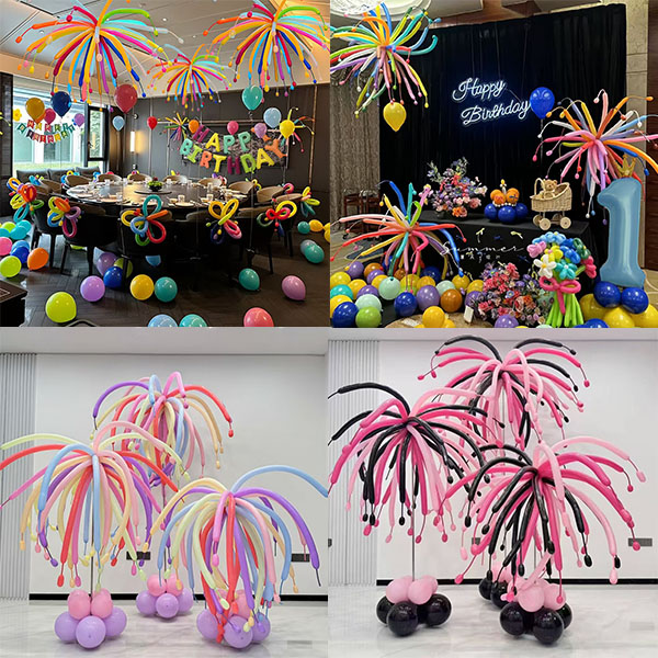 Pour la conception de forme. L'inspiration vient des feux d'artifice qui éclatent dans le ciel nocturne. Ils sont brillants, dynamiques et accrocheurs. Il copie parfaitement la forme des feux d'artifice lorsqu'ils éclatent. De longues bandes de ballon s'étendent et s'étendent du centre. De petits ballons sont ajoutés aux extrémités. Ils ressemblent à des étincelles dans l'explosion de feux d'artifice. Réaliste et vif. Accrochez-les au plafond de la fête. Ou mettez-les sur le sol comme des piliers décoratifs. Ils créent un bel effet visuel des feux d'artifice qui éclatent instantanément. Les invités de la fête auront l'impression d'être dans un feu d'artifice. Immergé dans une atmosphère heureuse et animée. De plus, la base de ballons en bas est bien conçue. Des ballons en forme de feu d'artifice avec des correspondances de couleurs différentes. Leurs bases utilisent des combinaisons de ballon assorties. La base maintient le ballon stable. Il améliore également la beauté décorative globale. Fait tout le ballon en forme d'artifice intégré de haut en bas. Devient une belle vue à la fête.