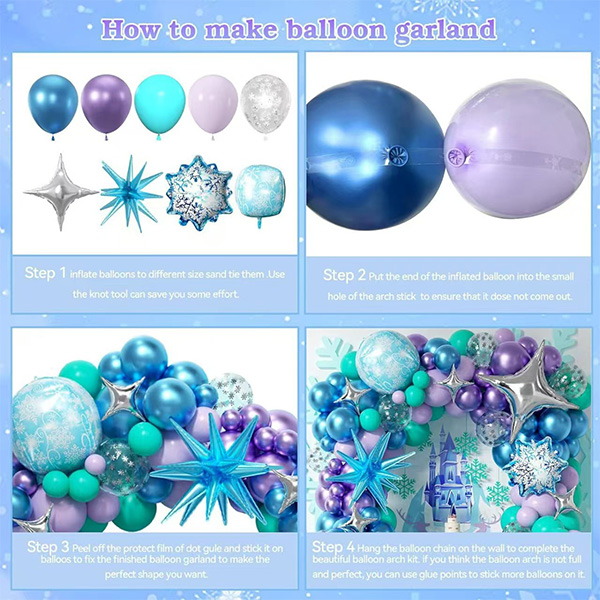 Outre les ballons ordinaires, le kit comprend de nombreux éléments thématiques. Il y a de grands ballons en aluminium en forme de flocon de neige. Ils ont des textures délicates. Ils ressemblent aux flocons de neige magiques créés par Elsa dans le film. Vous pouvez les utiliser pour construire une arche. Vous pouvez également les utiliser pour décorer un mur de fond. Ces couleurs se mélangent. Ils créent instantanément une atmosphère comme si on se trouvait dans un royaume de glace et de neige.