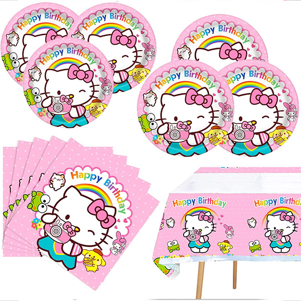 3) Vaisselle : la vaisselle Hello Kitty peut toujours être associée aux motifs uniques de l'ensemble de fournitures de fête rose et blanc pour créer une atmosphère mignonne pour votre fête. Tous les produits sont très durables, aux couleurs vives et ont un toucher de haute qualité.