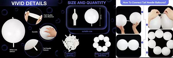 Nos ballons à liaison rapide se démarquent avec leur conception unique de bout en bout, éliminant le besoin d'outils. Par rapport aux ballons traditionnels, le processus de connexion avancée des ballons de liaison est plus simple et plus rapide, vous permettant de décorer plus efficacement votre lieu de fête ou d'événement.