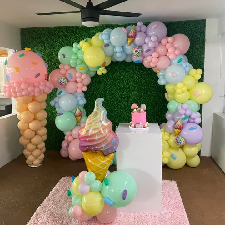 Macaroon Ice Cream Balloon Arch Garland Kit contient des ballons en latex de différentes couleurs et tailles, poudre de maca, bleu Maca, jaune maca, vert maca et maca violet, ainsi que de longs ballons de diverses couleurs de maca et ballons à la crème glacée en papier d'aluminium. Une fois que ces ballons sont gonflés, ils sont assemblés à travers des chaînes de ballons, des points de colle et des rubans pour compléter un magnifique macaron de crème glacée en ballon Garland. La guirlande de macaron de macaron colorée peut être spécialement conçue pour votre fête ou votre événement. C'est un choix parfait pour les fêtes en plein air, les fêtes scolaires, les fêtes d'entreprise ou de famille, les célébrations de remise des diplômes, les décorations de vacances et les jeux de plein air, en particulier adaptés aux anniversaires pour enfants, aux fêtes pour bébés, aux révélations de genre, aux licornes, aux arcs-en-ciel, aux sirènes, aux parties de pilier des filles. Créez un thème Rainbow Balloon pour votre fête ou tout événement à thème.