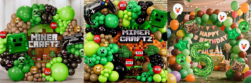 Minecraft Foil Balloon, de petits ensembles sont conçus pour des fêtes faciles ou de petits rassemblements. Ils mélangent différents styles de ballons en papier ou les associent à un petit nombre de ballons en latex pour créer des ensembles. L'ensemble «Caracter + Item» a des ballons Steve, des ballons à épée en diamant et des ballons à thème ronds. L'ensemble «Number + Scene» a des ballons de numéro et des ballons en blocs de gazon. Les ballons dans un jeu correspondent les uns aux autres. Vous pouvez rapidement faire un thème sans aucun effort supplémentaire.