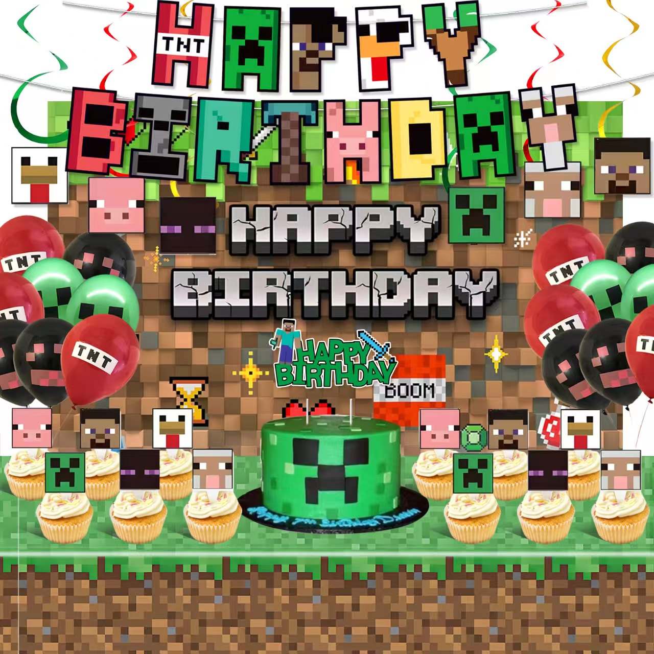 Chaque produit peut imprimer des pièces Minecraft. Le design peut montrer de l'herbe, des blocs de saleté, du ciel de pixels, etc. La conception peut ajouter des mots. Les mots peuvent être un bon anniversaire ou une heure de fête. L'ambiance de la fête a l'air forte.