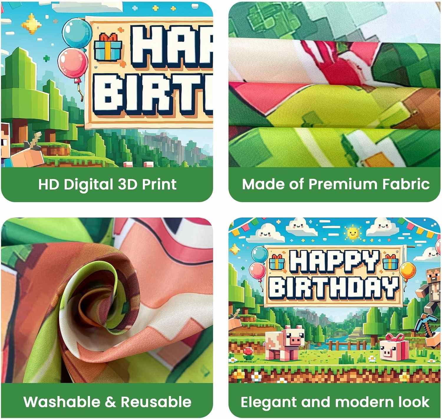 La toile de fond de Minecraft est la principale partie visuelle de la scène du parti. Le design prend des idées de parties de jeu classiques. Il montre le ciel de pixel, l'herbe, les arbres, les bâtiments et Steve. Ces pièces se joignent pour faire une scène mondiale de bloc complet. L'image a une couleur vive. L'image a de riches couches. Les mots joyeux anniversaire en style pixel ont l'air clair. Les mots attirent l'attention. La toile de fond fait que le Party Place se ressemble à un jeu à la fois.