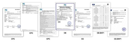 Notre gamme complète de produits a passé les certifications CPC, CE, EN71 et autres certifications faisant autorité, en stricte conformité avec les réglementations de sécurité européennes, américaines et autres marchés cibles. Ces qualifications peuvent aider vos marchandises à passer la douane en douceur et à éviter complètement les risques de non-conformité sur les marchés étrangers.
