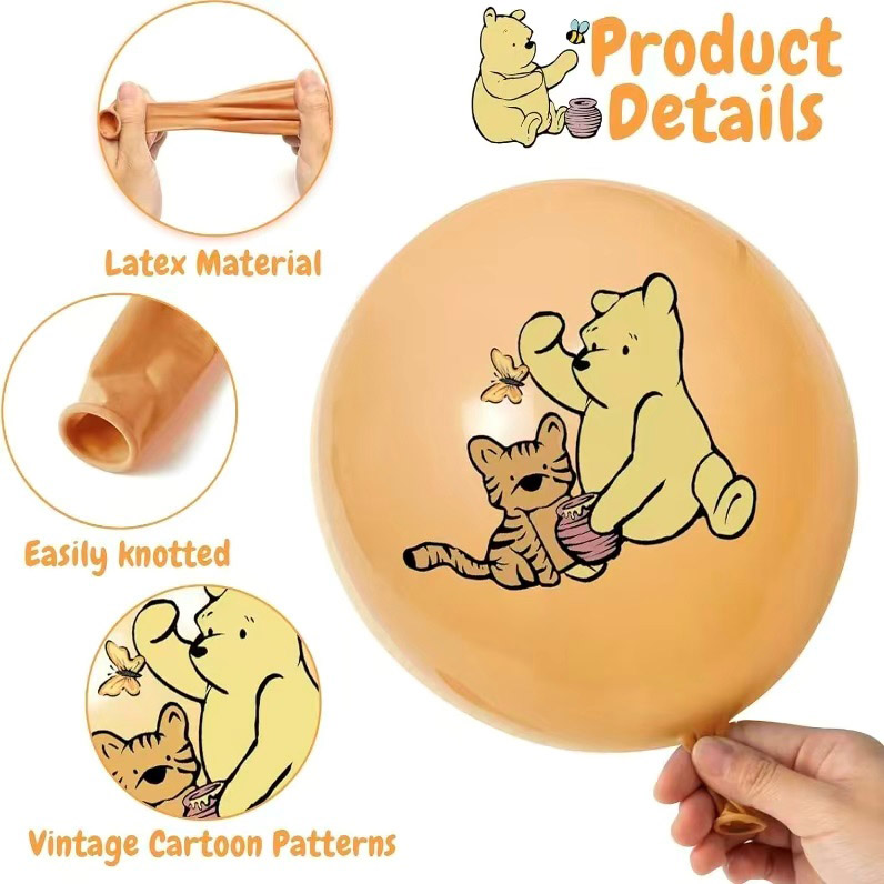 Le Winnie l'oursonballons en latexont de nombreux personnages célèbres. Il y a Winnie l'ourson, Porcinet, Bourriquet et d'autres. De petites abeilles volent également autour du pot. Tout cela met la scène joyeuse du bois de cent acres sur les ballons. Chaque motif copie soigneusement les détails de l'animation. Le look mignon de Winnie l'ourson ressort sur les ballons. Le style ludique de Porcinet se démarque également. Ils rappellent immédiatement aux gens leur enfance. Les enfants peuvent profiter du charme de cette IP. Les parents peuvent aussi en profiter.